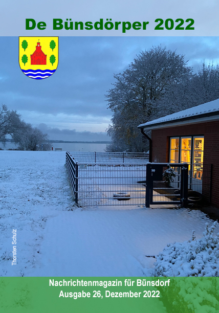 Seit den Ende des vergangenen Jahrtausends erscheint De Bünsdörper mindestens einmal im Jahr, diesmal mit einer kleinen Neuerung: Wer aus dem Dorf den Lesern etwas mit einer Kleinanzeige anbieten möchte, erhält dazu jetzt kostenlos die Möglichkeit. Drei Beispiele dafür kann man schon in dieser Ausgabe finden. Sonst aber bleibt De Bünsdörper bei der bewährten Zielsetzung, allen Bünsdorfern Nachrichten aus Bünsdorf und Umgebung zugänglich zu machen, vor allem solche, die sonst von den Medien nicht erfasst werden. Diesmal sind es u. a. Lebenserinnerungen von Heinrich Bock, Rückblicke in das Leben von Hans Hargens, Aktivitäten des Altenclubs, Neuerungen im Kindergarten, Au-pair-Zeit in Kanada, Jüngstensegeln und die seit Jahren gewohnten Rubriken aus dem Dorfleben. Ich freue mich, dass De Bünsdörper auch diesmal noch in der Adventszeit fertig werden konnte und so unsere besten Wünsche für Weihnachten und das Neue Jahr an unsere Leser mitnehmen kann!