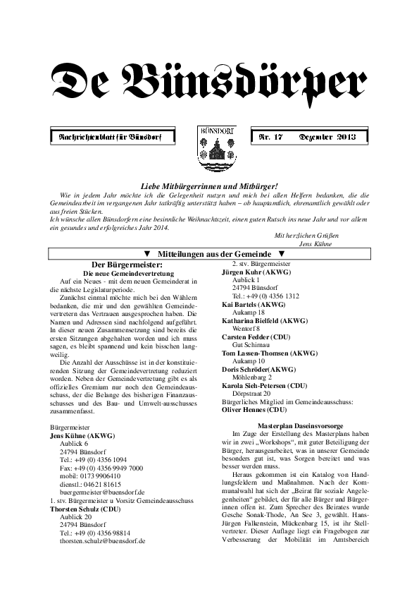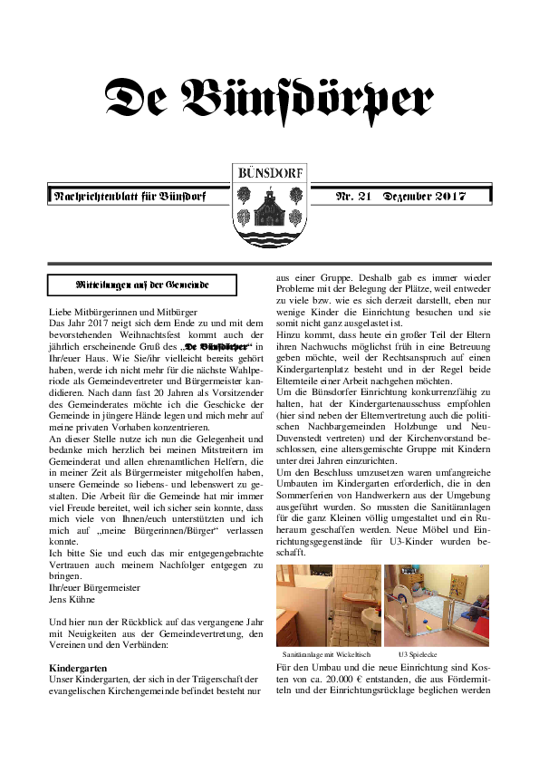 Das Jahr 2017 neigt sich dem Ende zu und mit dem bevorstehenden Weihnachtsfest kommt auch der jährlich erscheinende Gruß des „De Bünsdörper“ in Ihr/euer Haus. Wie Sie/ihr vielleicht bereits gehört haben, werde ich nicht mehr für die nächste Wahlperiode als Gemeindevertreter und Bürgermeister kandidieren. Nach dann fast 20 Jahren als Vorsitzender des Gemeinderates möchte ich die Geschicke der Gemeinde in jüngere Hände legen und mich mehr auf meine privaten Vorhaben konzentrieren. An dieser Stelle nutze ich nun die Gelegenheit und bedanke mich herzlich bei meinen Mitstreitern im Gemeinderat und allen ehrenamtlichen Helfern, die in meiner Zeit als Bürgermeister mitgeholfen haben, unsere Gemeinde so liebens- und lebenswert zu gestalten. Die Arbeit für die Gemeinde hat mir immer viel Freude bereitet, weil ich sicher sein konnte, dass mich viele von Ihnen/euch unterstützten und ich mich auf „meine Bürgerinnen/Bürger“ verlassen konnte. Ich bitte Sie und euch das mir entgegengebrachte Vertrauen auch meinem Nachfolger entgegen zu bringen.