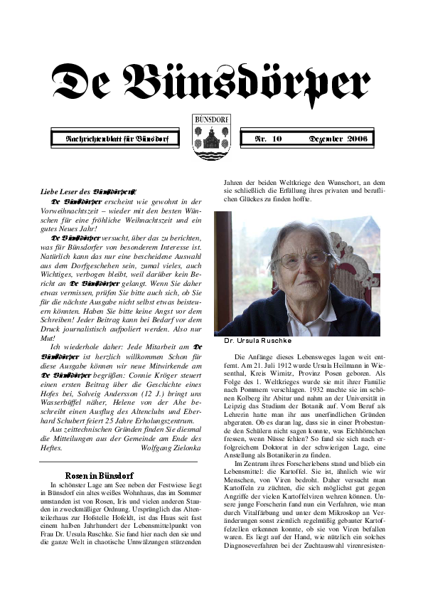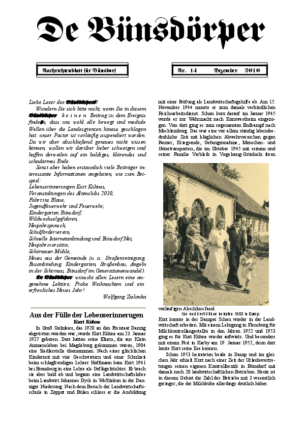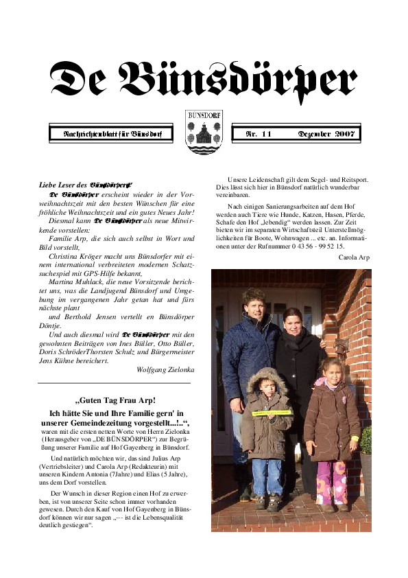 De Bünsdörper erscheint wie gewohnt in der Vorweihnachtszeit – wieder mit den besten Wünschen für eine fröhliche Weihnachtszeit und ein gutes Neues Jahr! De Bünsdörper versucht, über das zu berichten, was für Bünsdorfer von besonderem Interesse ist. Natürlich kann das nur eine bescheidene Auswahl aus dem Dorfgeschehen sein, zumal vieles, auch Wichtiges, verbogen bleibt, weil darüber kein Bericht an De Bünsdörper gelangt. Wenn Sie daher etwas vermissen, prüfen Sie bitte auch sich, ob Sie für die nächste Ausgabe nicht selbst etwas beisteuern könnten. Haben Sie bitte keine Angst vor dem Schreiben! Jeder Beitrag kann bei Bedarf vor dem Druck journalistisch aufpoliert werden. Also nur Mut! Ich wiederhole daher: Jede Mitarbeit am De Bünsdörper ist herzlich willkommen Schon für diese Ausgabe können wir neue Mitwirkende am De Bünsdörper begrüßen: Connie Kröger steuert einen ersten Beitrag über die Geschichte eines Hofes bei, Solveig Andersson (12 J.) bringt uns Wasserbüffel näher, Helene von der Ahe beschreibt einen Ausflug des Altenclubs und Eberhard Schubert feiert 25 Jahre Erholungszentrum. Aus zeittechnischen Gründen finden Sie diesmal die Mitteilungen aus der Gemeinde am Ende des Heftes.