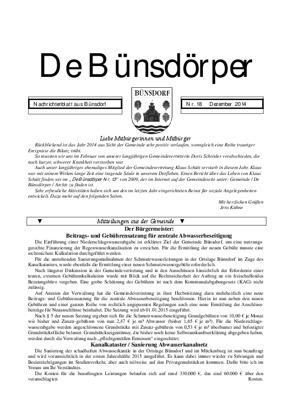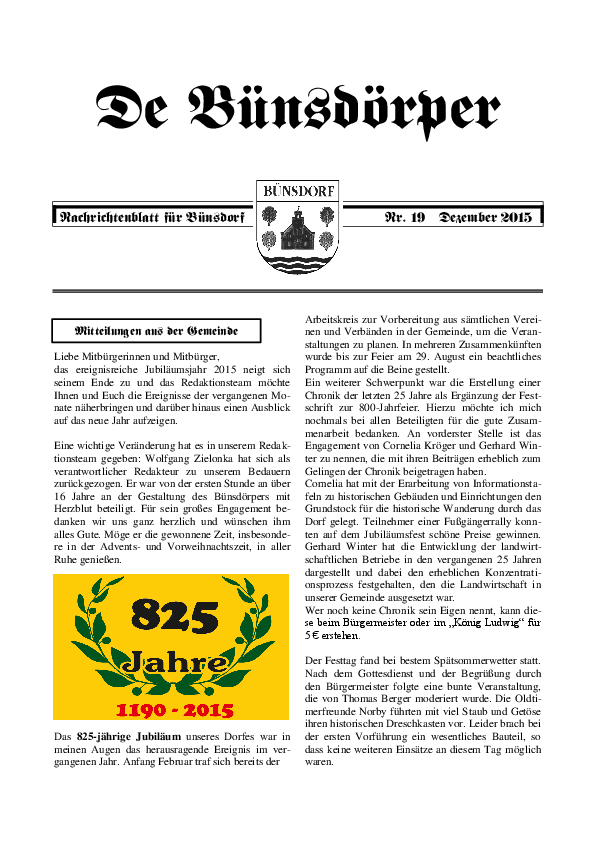 Heute liegt Ihnen nun eine weitere Ausgabe unseres Gemeindeblattes De Bünsdörper vor.
