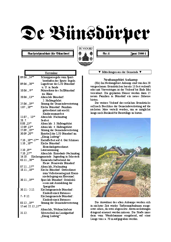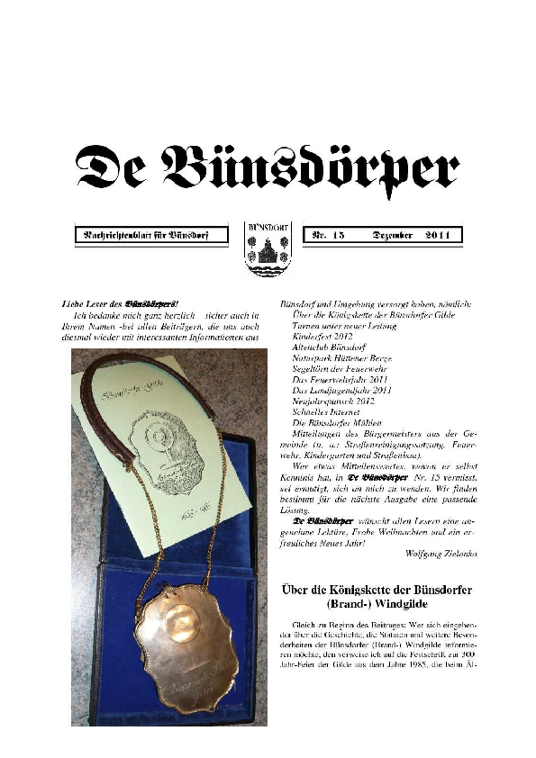 Wer etwas Mitteilenswertes, wovon er selbst Kenntnis hat, in De Bünsdörper Nr. 15 vermisst, sei ermutigt, sich an mich zu wenden. Wir finden bestimmt für die nächste Ausgabe eine passende Lösung.