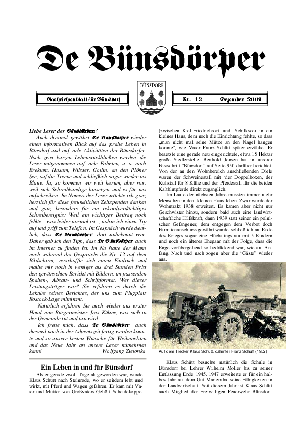 Auch diesmal gewährt De Bünsdörper wieder einen informativen Blick auf das pralle Leben in Bünsdorf und auf viele Aktivitäten der Bünsdorfer. Nach zwei kurzen Lebensrückblicken werden die Leser mitgenommen auf viele Fahrten, u. a. nach Breklum, Husum, Wilster, Gollin, an den Plöner See, auf die Treene und schließlich sogar wieder ins Blaue. Ja, so kommen wir weit herum, aber nur, weil sich Schreibkundige hinsetzen und es für uns aufschreiben. Im Namen der Leser möchte ich ganz herzlich für diese freundlichen Zeitspenden danken und ganz besonders für ein rekordverdächtiges Schreibereignis: Weil ein wichtiger Beitrag noch fehlte - was leider normal ist -, nahm ich einen Tip auf und griff zum Telefon. Im Gespräch wurde deutlich, dass De Bünsdörper dort unbekannt war. Daher gab ich den Tipp, dass De Bünsdörper auch im Internet zu finden ist. Im Nu hatte der Mann noch während des Gesprächs die Nr. 12 auf dem Bildschirm, verschaffte sich einen Eindruck und mailte mir noch in weniger als drei Stunden Frist den gewünschten Bericht mit Bildern, im passenden Spalten-, Absatz- und Schriftformat. Wer dieser Leistungsträger war? Sie erfahren es durch die Lektüre seines Berichtes, der uns zum Flugplatz Rostock-Lage mitnimmt. Natürlich erfahren Sie auch wieder aus erster Hand vom Bürgermeister Jens Kühne, was sich in der Gemeinde tut und tun wird. Ich freue mich, dass De Bünsdörper auch diesmal noch in der Adventszeit fertig werden konnte und so unsere besten Wünsche für Weihnachten und das Neue Jahr an unsere Leser mitnehmen kann!