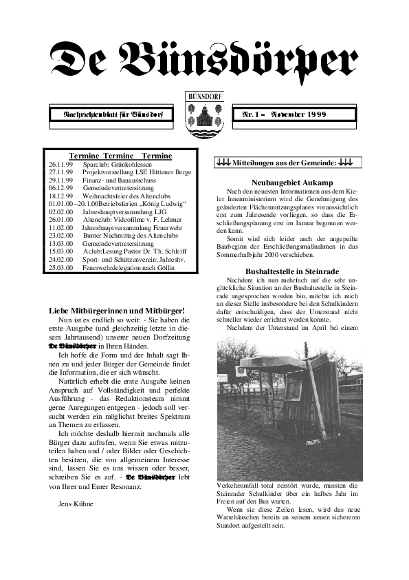 Nun ist es endlich so weit: - Sie haben die erste Ausgabe (und gleichzeitig letzte in diesem Jahrtausend) unserer neuen Dorfzeitung De Bünsdörper in Ihren Händen.