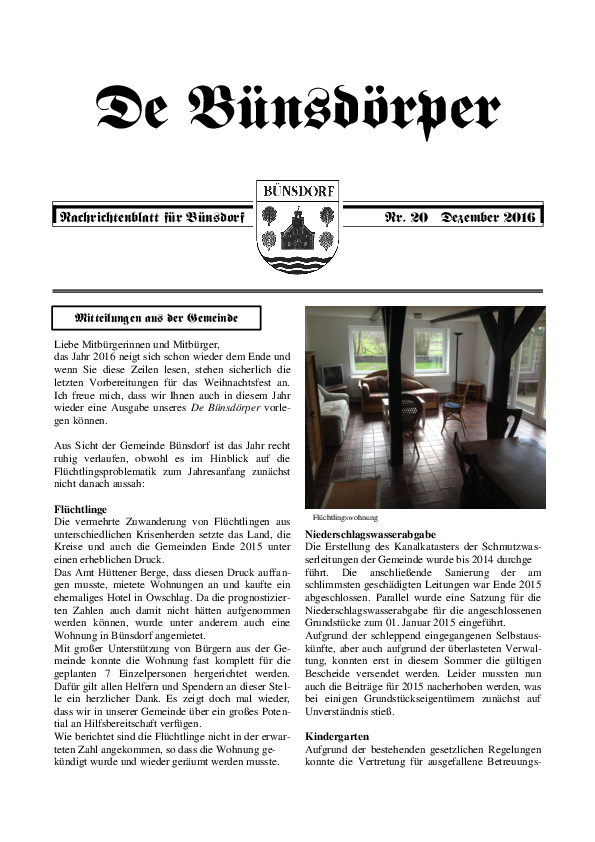 das Jahr 2016 neigt sich schon wieder dem Ende und wenn Sie diese Zeilen lesen, stehen sicherlich die letzten Vorbereitungen für das Weihnachtsfest an. Ich freue mich, dass wir Ihnen auch in diesem Jahr wieder eine Ausgabe unseres De Bünsdörper vorlegen können. Aus Sicht der Gemeinde Bünsdorf ist das Jahr recht ruhig verlaufen, obwohl es im Hinblick auf die Flüchtlingsproblematik zum Jahresanfang zunächst nicht danach aussah.