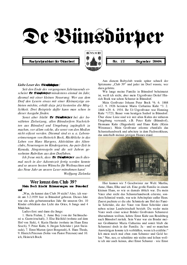 De Bünsdörper erscheint diesmal wieder vor Weihnachten! So kann De Bünsdörper sein Erscheinen mit den besten Wünschen für eine fröhliche Weihnachtszeit und ein gutes Neues Jahr verbinden! De Bünsdörper bringt neben Berichten und Ankündigungen über das Dorfgeschehen (auch aus der Welt der Kinder!) eine Aktion zum Mitmachen. Alte Fotos werden oft erst durch die Erinnerungen, die sie hie und da noch wecken, wertvoll und interessant. Diese Erinnerungen möchten wir gern hervorlocken, damit sie erzählt, weitergegeben und auf Dauer festgehalten werden können. Wir machen den Anfang mit der Veröffentlichung von Fotos auf alten Postkarten. Beim Betrachten der Bilder in der Redaktionsrunde tauchten allerlei Geschichten, aber auch einige Fragezeichen auf und wir dachten, dass sich in manchem Haushalt noch mehr solch