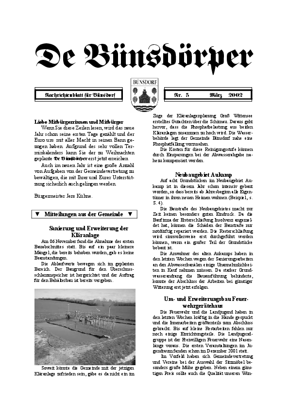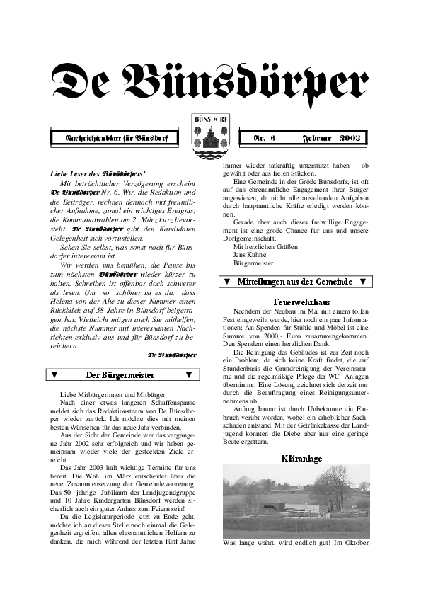Nach einer etwas längeren Schaffenspause meldet sich das Redaktionsteam von De Bünsdörper wieder zurück. Ich möchte dies mit meinen besten Wünschen für das neue Jahr verbinden. Aus der Sicht der Gemeinde war das vergangene Jahr 2002 sehr erfolgreich und wir haben gemeinsam wieder viele der gesteckten Ziele erreicht. Das Jahr 2003 hält wichtige Termine für uns bereit. Die Wahl im März entscheidet über die neue Zusammensetzung der Gemeindevertretung. Das 50- jährige Jubiläum der Landjugendgruppe und 10 Jahre Kindergarten Bünsdorf werden sicherlich auch ein guter Anlass zum Feiern sein! Da die Legislaturperiode jetzt zu Ende geht, möchte ich an dieser Stelle noch einmal die Gelegenheit ergreifen, allen ehrenamtlichen Helfern zu danken, die mich während der letzten fünf Jahre immer wieder tatkräftig unterstützt haben – ob gewählt oder aus freien Stücken. Eine Gemeinde in der Größe Bünsdorfs, ist oft auf das ehrenamtliche Engagement ihrer Bürger angewiesen, da nicht alle anstehenden Aufgaben durch hauptamtliche Kräfte erledigt werden können. Gerade aber auch dieses freiwillige Engagement ist eine große Chance für uns und unsere Dorfgemeinschaft.
