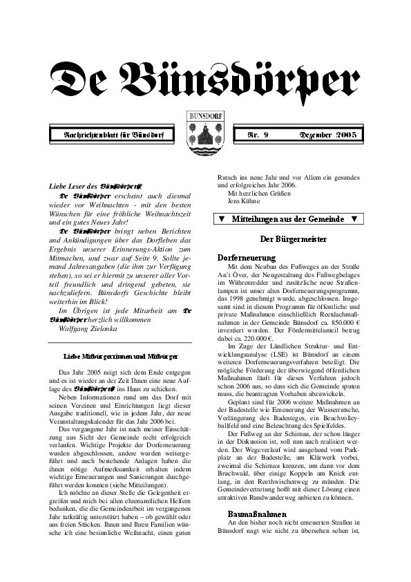 Das Jahr 2005 neigt sich dem Ende entgegen und es ist wieder an der Zeit Ihnen eine neue Auflage des Bünsdörpers ins Haus zu schicken. Neben Informationen rund um das Dorf mit seinen Vereinen und Einrichtungen liegt dieser Ausgabe traditionell, wie in jedem Jahr, der neue Veranstaltungskalender für das Jahr 2006 bei. Das vergangene Jahr ist nach meiner Einschätzung aus Sicht der Gemeinde recht erfolgreich verlaufen. Wichtige Projekte der Dorferneuerung wurden abgeschlossen, andere wurden weitergeführt und auch bestehende Anlagen haben die ihnen nötige Aufmerksamkeit erhalten indem wichtige Erneuerungen und Sanierungen durchgeführt werden konnten (siehe Mitteilungen). Ich möchte an dieser Stelle die Gelegenheit ergreifen und mich bei allen ehrenamtlichen Helfern bedanken, die die Gemeindearbeit im vergangenen Jahr tatkräftig unterstützt haben – ob gewählt oder aus freien Stücken. Ihnen und Ihren Familien wünsche ich eine besinnliche Weihnacht, einen guten Rutsch ins neue Jahr und vor Allem ein gesundes und erfolgreiches Jahr 2006.